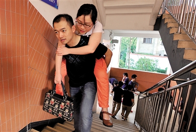 最后,夏华艳和丈夫商量,每天早上,由丈夫开车送自己到学校,再背着她进教室,放学后,再等丈夫来背她。夏华艳特别感激丈夫的支持,“如果不是他每天背我上下班,我也不可能坚持下来。”