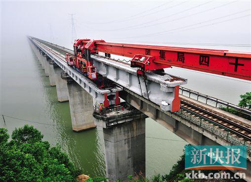 6月1日,施工人员在九景衢铁路鄱阳湖特大桥架设最后一孔箱梁。