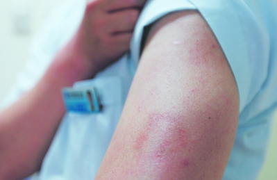 图②:精神科护士是一项高风险的工作,几乎所有护士都有过被患者踢打挠伤的经历。现任睡眠医学科护士长郑书传的手臂上,四年前被患者咬的牙印至今还清晰可见。郑书传是一名男护士,目前,仙岳医院共有护士341名,男护士仅有20多名。