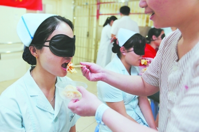 图③:在一次活动中,社工们设计了一个环节,让护士与患者、家属和患者互换角色,平时照顾患者的护士或家属被蒙上眼睛,由患者给他们喂饺子吃。