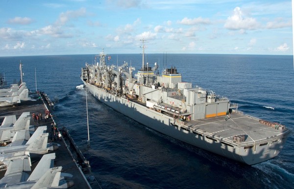 5月29日,美国海军DDG-93和DDG-106驱逐舰在南海上进行海上补给。