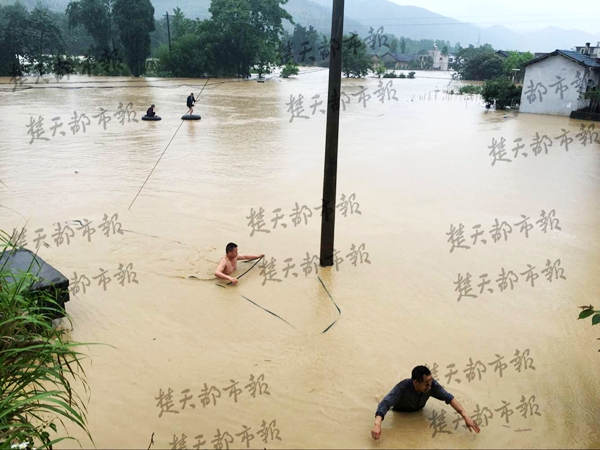 王璋涛一大早就去汪家迎亲,不料,水涨得太快,没多久两村间被两处洪水阻断,他接到新娘后,已经没法回自己家了。(楚天都市报记者周鹏通讯员马丽娅)