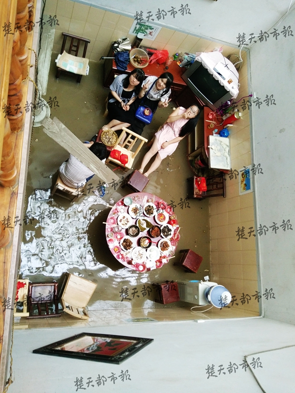 按当地规矩,中午要办婚宴。一对新人临时决定,在新娘家二楼办仪式,又在水中的一楼简单办了婚宴。(楚天都市报记者周鹏通讯员马丽娅)