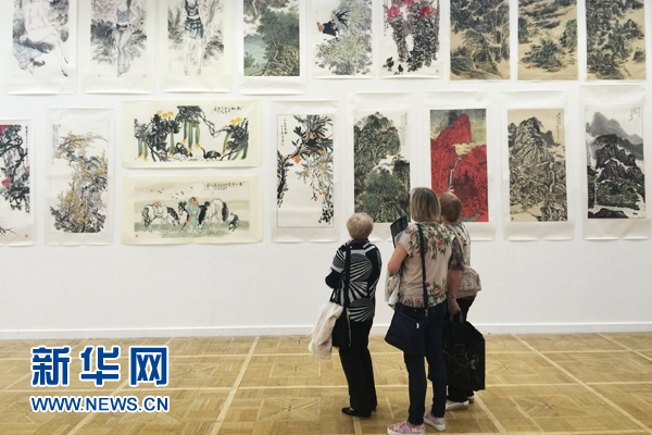 6月4日,参观者欣赏“水墨聚焦·2016走进俄罗斯”书画展的作品。 新华网记者戴天放摄