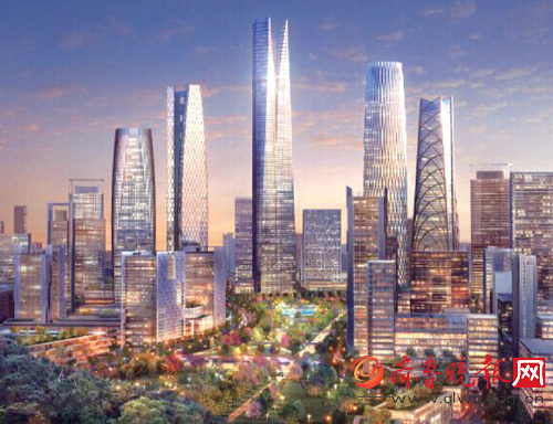 中央商务区规划建设5座超高层建筑,图中最高的建筑即420米高的代表“山”的超高层。规划设计图