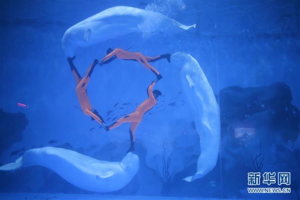 6月6日,在天津海昌极地海洋世界,驯养员与白鲸一同组成“风火轮”造型。当日,天津海昌极地海洋世界全新推出的“白鲸之恋”水下表演首次亮相,表演中三名驯养员和三头白鲸共同演绎的“风火轮”造型惊艳全场,为观众带来美妙的视觉感受。新华社发(游思行摄)