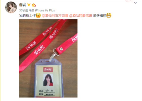 原标题:柳岩微博晒工牌 正式宣布入职酒仙网