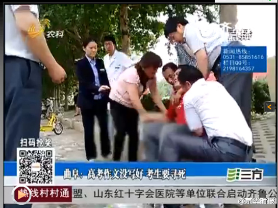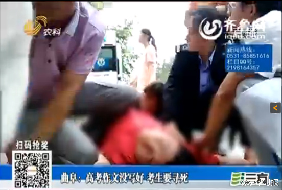 【考生因作文没写好要寻死被父母按地上狂叫】昨日,曲阜一考生因作文没写好,情绪失控,竟然要寻死。考生口中大喊:不过了,让我去死。父母及老师立即将该考生按倒,一起开导该考生。该考生情绪异常激动,期间还咬伤