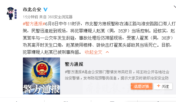 “清江路与淮安路路口有人打架!”8日11时许,市北警方接报警称在清江路与淮安路路口有人打架,民警迅速赶到现场,将犯罪嫌疑人赵某(男,35岁)当场控制。