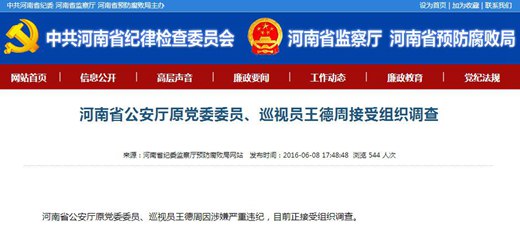 人民网郑州6月8日电 (侯琳琳) 据河南省纪委监察厅官方网站发布消息:河南省公安厅原党委委员、巡视员王德周涉嫌严重违纪,目前正接受组织调查。