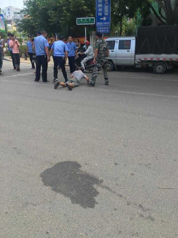 李正义提供的现场照片显示,其父亲趴在公路上,被一身着城管制服的人员坐压着。