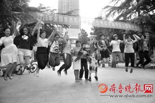 8日下午,在济南山师附中考点外,顺利考完的考生和老师一起跳跃欢呼,庆祝自己完成高考。 齐鲁晚报记者 周青先 实习生 刘海天 摄