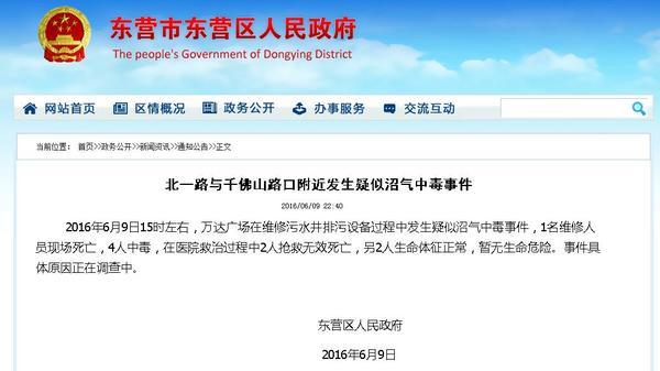 据东营市东营区官方网站消息,2016年6月9日15时左右,万达广场在维修污水井排污设备过程中发生疑似沼气中毒事件,1名维修人员现场死亡,4人中毒,在医院救治过程中2人抢救无效死亡,另2人生命体征正常,暂无生命危险。事件具体原因正在调查中。