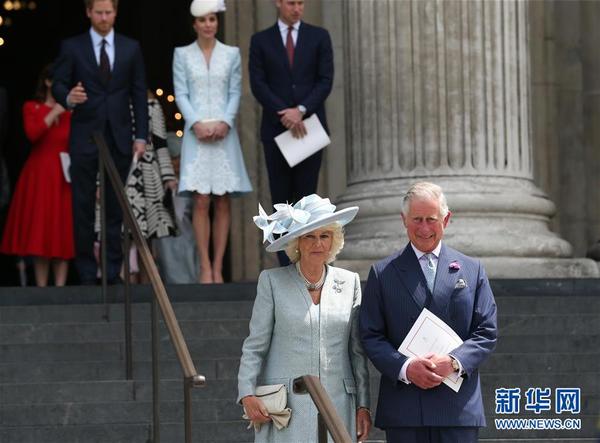 6月10日,在英国伦敦,查尔斯王子(前右)及妻子卡米拉(前左)参加全国感恩仪式后离开圣保罗大教堂。当日,圣保罗大教堂举行全国感恩仪式,庆祝英国女王伊丽莎白二世90岁生日。英国女王伊丽莎白二世出生于1926年4月21日,她每年要庆祝两次生日,一次是4月21日出生的日期,另一个官方生日庆祝活动在6月举行。新华社记者韩岩摄