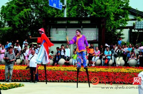 6月9日上午,被列为济南市非遗项目的东舍坊高跷队在刚开放的百花洲旁表演。高跷队成员用“摸爬滚打”等动作演绎着民间传说和名著里的各种故事,吸引了不少市民游客围观叫好。在百花洲南侧的建筑内,有非遗传习所,不少非遗艺人在此表演展示自己的作品。