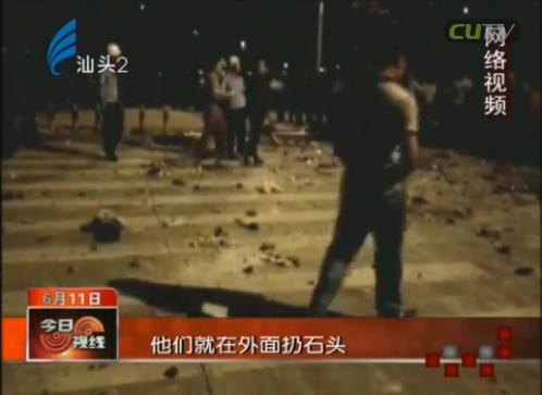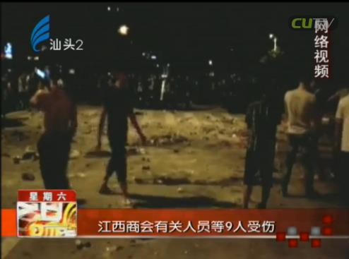 “现场来的交警是来处理交通事故的,现场来的公安是来维持秩序的,有些外围的人,他们不明情况,他们就在外面扔石头。我们的会长这里受伤了,还有我们一个工信会长这里也流血了。”——潮汕江西商会副秘书长 刘清平