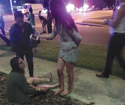 从枪击案现场逃出后,伤者坐在路边,身上血迹可见。
