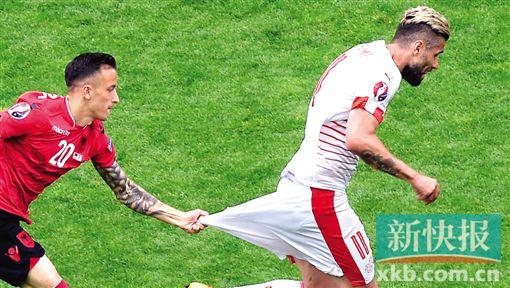 瑞士中场悍将贝赫拉米险些走光!在北京时间前晚进行的欧洲杯小组赛首轮瑞士与阿尔巴尼亚的比赛下半场,阿尔巴尼亚替补上场的卡切后场回追犯规时差点拽下了贝赫拉米的球裤(右图)。