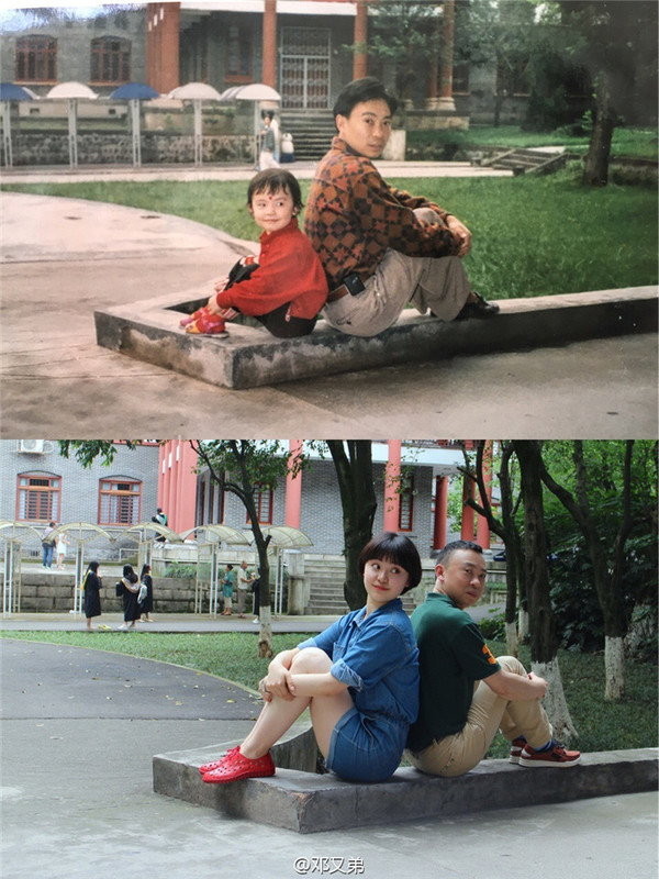 1997年的6月15日,邓又天额头上点了一颗美人痣,一身红衣与爸爸在图书馆前的水泥围栏上背靠背留影。照片中,一团红色小不点儿靠在爸爸身后,点缀着爸爸的身躯。爸爸身着花衬衫,一副文艺青年的模样。19年后,图书馆变成了艺术楼,当年的小不点儿变成了很大一团,即使是坐下来,个头也比爸爸高。爸爸还是一条米色长裤,花衬衣变成了绿T恤,背景中多了几个身着学士服的毕业生,无声地提醒大家这是一个毕业季。