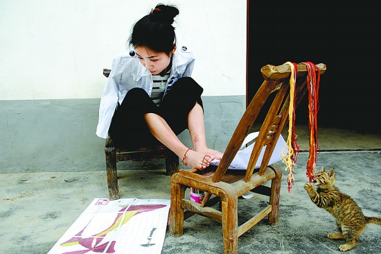 陕西省平利县姑娘杨佩一边用脚穿针引线,一边琢磨十字绣的图案(5月25日摄)。