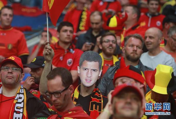 6月13日,一名比利时球迷戴着比利时球员阿扎尔的面具为球队加油。当日,在法国里昂进行的2016年欧洲足球锦标赛小组赛E组比赛中,比利时队对阵意大利队。 新华社记者张帆摄