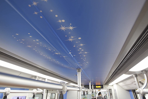 迪士尼主题列车车顶为蓝色星光。澎湃见习记者 韦毅 图
