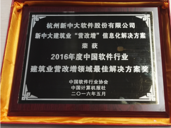 2016年5月26日,在第二十届中国国际软件博览会开幕式暨2016中国软件和信息技术服务业发展高峰论坛上,新中大建筑业“营改增”信息化解决方案荣获2016年度中国软件行业建筑业营改增领域最佳解决方案奖。