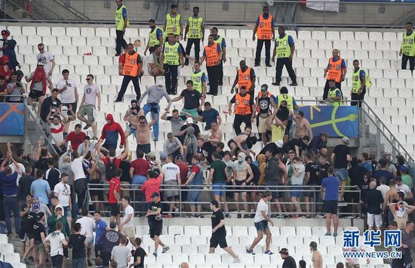 6月14日,针对11日俄罗斯球迷在看台上追打英格兰球迷的恶劣行为,欧足联开出罚单,俄足协被处以15万欧元的罚款以及“缓期逐出欧锦赛”的处罚。 6月11日,英格兰队在马赛与俄罗斯队战成1比1平。比赛的赛前和赛后双方球迷都爆发了冲突。在暴力冲突事件中,有大约35人受伤,其中4人伤势严重,他们大多是英格兰球迷。在3天的暴力冲突中,总共有20人被捕。图为6月11日,在俄罗斯队与英格兰队的比赛后,安保人员在看台上制止爆发冲突的球迷。 新华社/美联