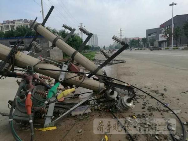 因昨日暴风雨,泰安城区一处路段近十根电线杆被连根拔起