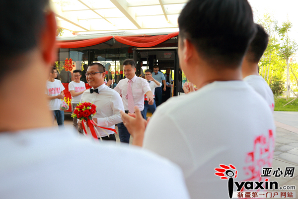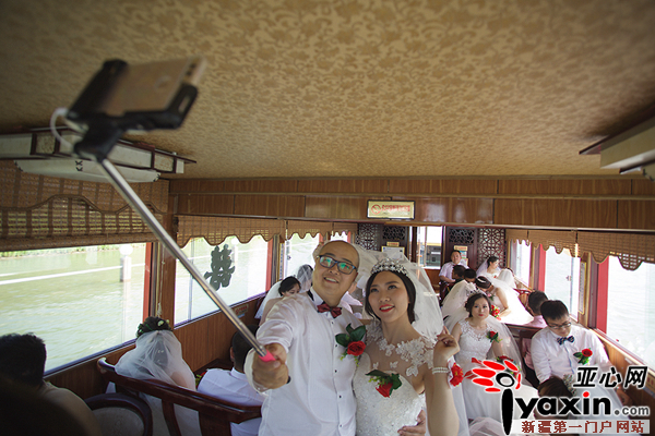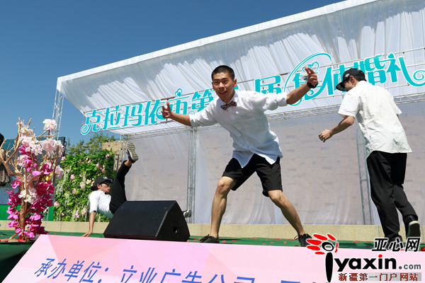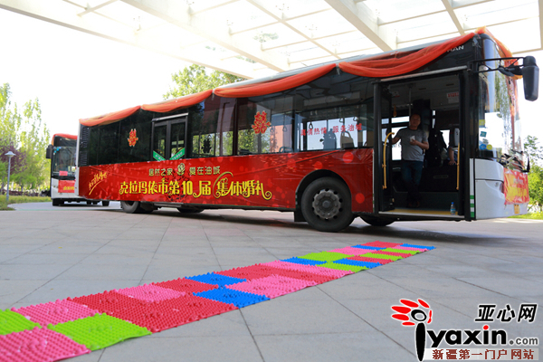当日上午,12位英俊潇洒的新郎在雪莲宾馆通过“寻找真爱之旅”的方式,成功解开爱情密码,顺利迎接到他们心中最美的新娘。随后,新人乘坐2辆装饰一新的油城公交在“为爱护航”自行车志愿者的护送下,前往九龙潭景区码头,并乘坐爱情画舫沿美丽的克拉玛依河顺流而下,抵达婚礼主会场——世纪公园。6月的世纪公园景区蓝天碧水、花繁林秀。上午12时,一支浪漫的魔术表演及优美的爱情舞蹈拉开了集体婚礼的序幕。伴随着庄重的婚礼进行曲,一场充盈温馨浪漫的集体婚礼甜蜜举行。在现场嘉宾及亲友的见证下,12对新人从世纪公园未来广场缓步走下99米爱情天桥,步入充满童话色彩的婚礼舞台。12对新人有战天斗地的石油工人、有救死扶伤的白衣天使、有播撒知识的辛勤园丁、也有守卫百姓安全的消防战士,他们在克拉玛依经过浪漫美丽的相识、甜蜜深情的相恋,终于携手驶入幸福恩爱的港湾。