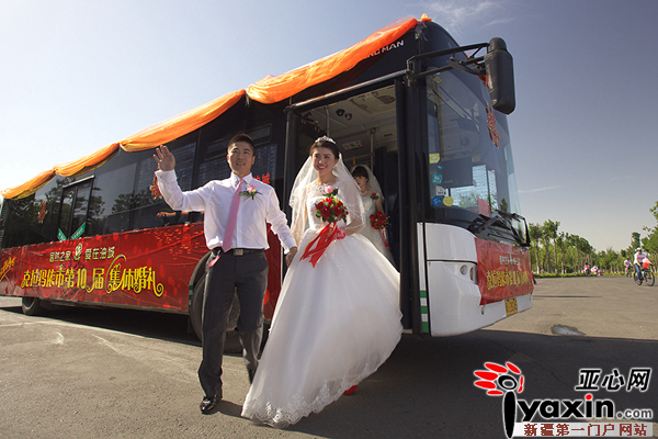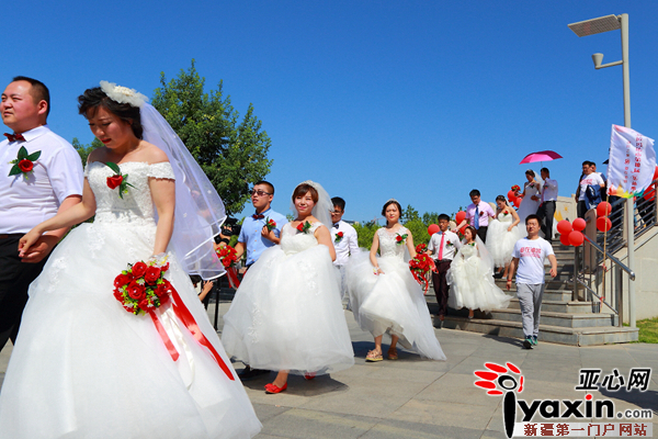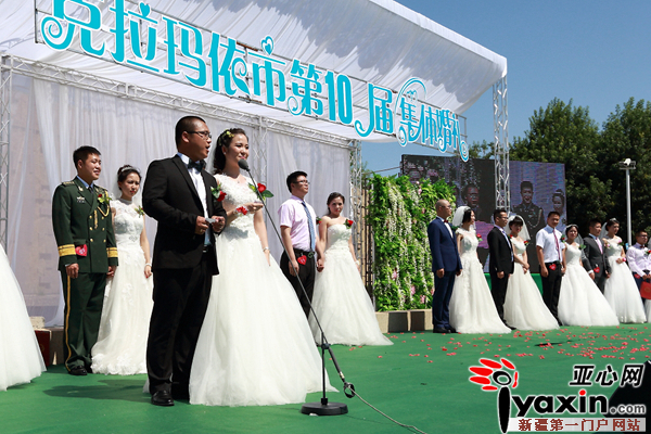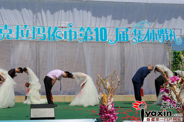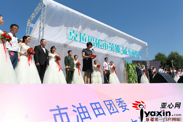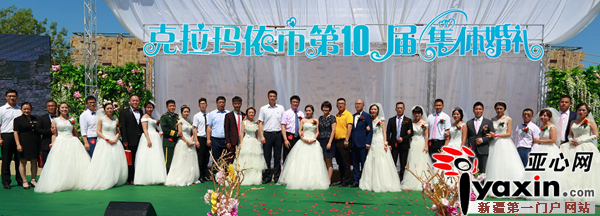 亚心网讯(通讯员 罗灵文)2016年6月10日,农历五月初六,由克拉玛依团市委主办的“爱在油城”克拉玛依市第10届集体婚礼在世纪公园景区甜蜜举行。12对来自克拉玛依各领域的新人在300余名亲友的祝福中喜结连理。市委常委祝贺香出席婚礼仪式并为新人证婚。