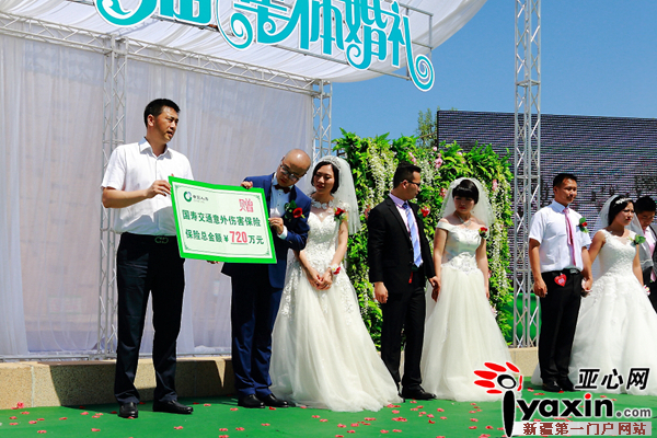市委常委祝贺香为12对新人证婚,祝福他们永结同心、白头偕老。团市委、居然之家克拉玛依店、中国人寿克拉玛依石油分公司分别代表主办方及赞助商上台为新人赠送了新婚礼包。碧罗珠宝、榆泉酒业、缌卡瑞化妆为新人提供了纪念品。新郎贺光喜、新娘陶紫君代表新人发言。一句承诺、一生相伴,风雨同路、相扶到老。一段感人至深的爱情誓言将婚礼推向高潮,一句“我愿意”承载着12对新人一路走来的苦辣甘甜。在全场亲朋好友的祝福声中,新人们用最幸福的合影为此次集体婚礼圆满礼成。