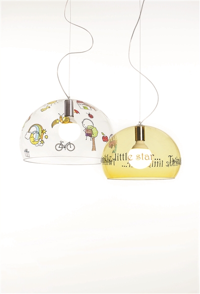 飞着的灯 圆圆的可爱姿态,色彩斑斓的手绘图案在晶莹剔透的灯罩上闪着温暖的光。Ferruccio Laviani费鲁吉欧·拉维亚尼的设计,把天马行空的想象挂在屋顶上。