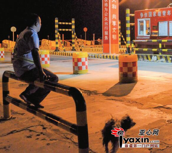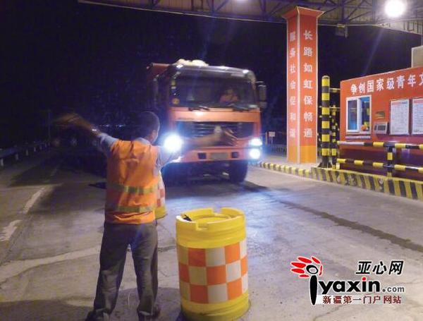 6月15日2时许,奎屯北收费站,收费站执勤员陈文涛在阻拦逃费大货车。亚心网记者陈峰摄