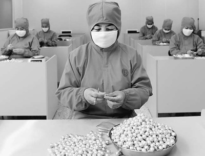 安宫牛黄丸使用的是天然麝香,这让张冬梅最头疼。她介绍,麝香里一些细微的绒毛要用手拿出来,不可能机器替代,既繁琐,又枯燥。拿毛这道工序,本身没有质量标准要求,但拿多少、拿到什么程度,凭的是药师心里那杆秤。