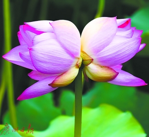 并蒂莲,茎秆一枝,花开两朵,可谓同心、同根、同福、同生的象征。在古代文学作品中,并蒂莲被誉为爱情的象征,寓意夫妻恩爱,美满幸福,也象征男女爱情缠绵,兄弟情同手足,感情深厚。广州日报记者黄文生 通讯员何荣文摄![]()