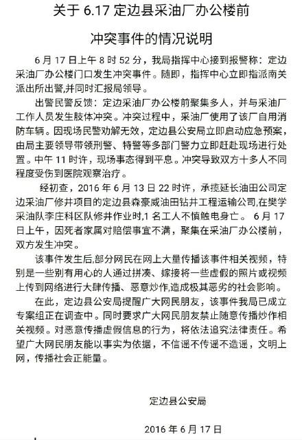 6月17日晚,定边县公安局通过官方微博发布说明称,经初查,6月13日22时许,承揽延长油田公司定边采油厂修井项目的定边县森豪威油田钻井工程运输公司,在樊学采油队李庄科区队修井作业时,1名工人不慎触电身亡。6月17日上午,因死者家属对赔偿事宜不满,聚集在采油厂办公楼前,双方发生冲突。