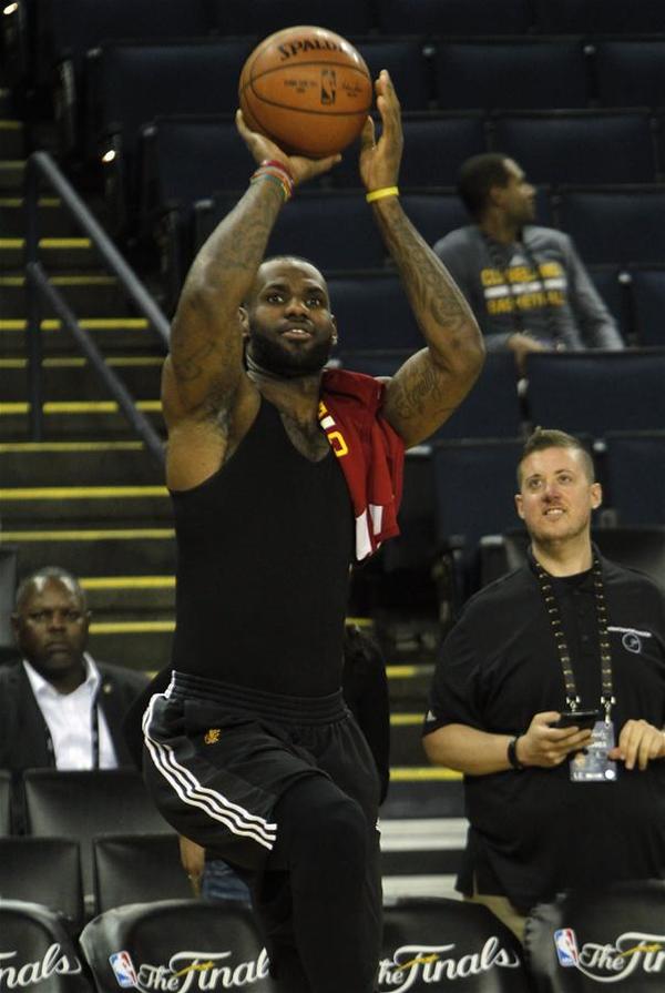 6月18日,骑士队球员詹姆斯(中)在训练中投篮。 当日,在2015-2016赛季NBA总决赛第七场比赛前,金州勇士队和克利夫兰骑士队分别在加州奥克兰的甲骨文球馆训练,备战将于当地时间19日进行的决胜局比赛。 新华社发(宋穹 摄)