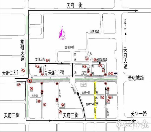 华西都市报讯(客户端记者 杨雪)6月20日,成都市交管局发布通知:为保障天府二街道路改造工程的顺利实施,维护施工路段及周边道路的交通安全与畅通,2016年6月23日至2016年9月23日,天府二街(天府大道路口-益州大道路口)道路半幅打围施工,实行机动车由东向西单向交通(含公交车)。