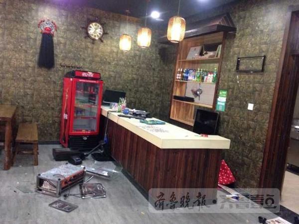 20日中午1点半,齐鲁晚报记者赶到被砸的一面三国面馆,看到面馆内一片狼藉,地上到处都是饮料玻璃瓶和塑料杯子的碎片,进门北侧的大玻璃裂了几道痕迹,收银台更是惨不忍睹,收银机、烤箱全部砸到了地上,墙上的电视机也被卸了下来,员工们忙着收拾,但很多人还没从刚才的惊吓中恢复过来。