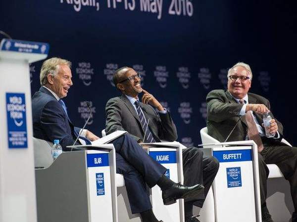 5月11日,卢旺达首都基加利市,卢旺达总统保罗·卡加梅(中)与英国前首相托尼·布莱尔(左)、巴菲特·霍华德(右)在世界经济论坛非洲峰会研讨会上交谈。(新华社发)