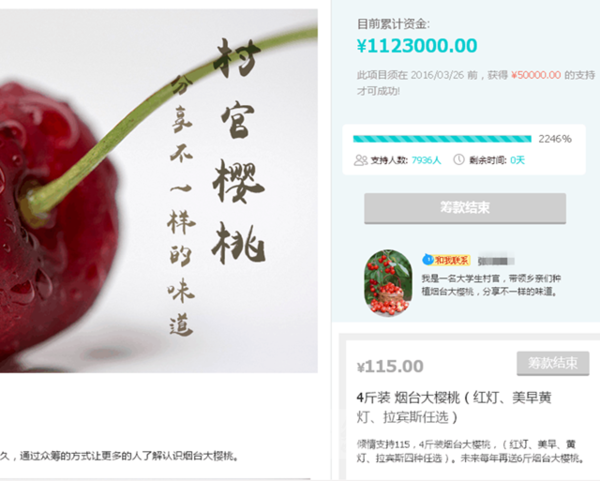 在“村官樱桃”众筹项目的页面上,记者看到该项目7936人支持,已筹款1123000元,卖家自 称是山东省栖霞市观里镇东南庄村一名大学生村官,大学主修农业,村里农业方面的事物都是他 来负责,说自己大三时候曾留学美国学习农业种植相关知识,并去智利考察车厘子种植。在众筹 页面上还有一张盖有“栖霞市观里镇东南庄村委”的推荐信,信中对当地樱桃进行了介绍和推荐 。