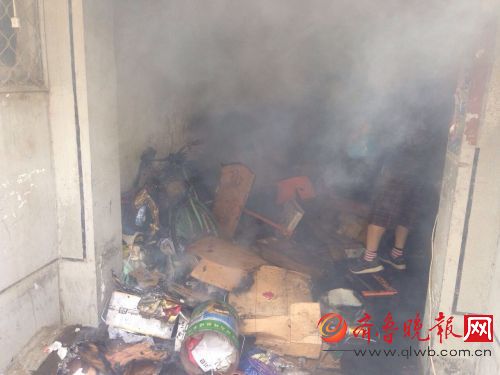 济南一小区楼道杂物突然着火 众人合力扑灭