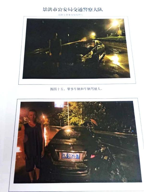 肇事现场照片显示,一辆号牌为云K58267的黑色轿车撞上路边护栏,右侧车门脱落,后保险杠损坏。资料显示,该轿车属景洪市纪委所有。