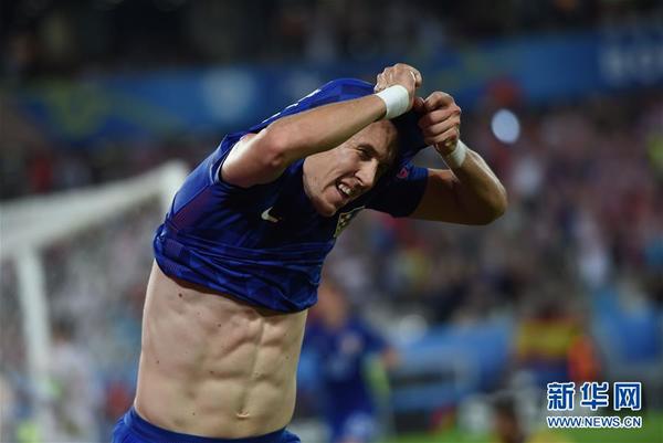 6月21日,克罗地亚队球员佩里西奇在进球后脱衣庆祝。当日,在法国波尔多进行的2016年欧洲足球锦标赛小组赛D组比赛中,克罗地亚队以2比1战胜西班牙队。 新华社记者陶希夷摄