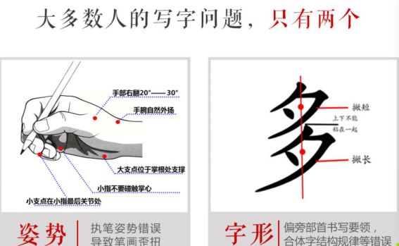 很多学生字写不好,究其原因,归结为两点,一是姿势不当,二是对字形结构理解不当。坐姿与执笔姿势的不当,导致笔画歪扭,是字写不好的基础病原。在汉翔书法的教学体系中,无论是软笔书法教学,还是硬笔集训课程,都强调从一开始就是培养学生正确的坐姿和握笔姿势。