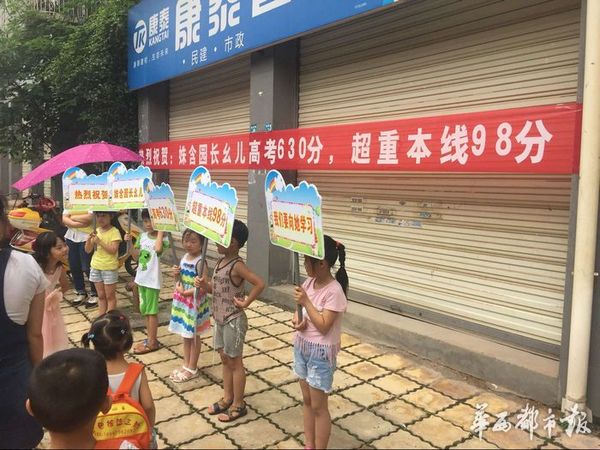华西都市报讯(客户端记者田雪皎)6月23日下午4时30分许,四川资阳城区一幼儿园门口,5位小朋友站成一排,各自举着一块牌子,连起来一句话为:“热烈祝贺姝含园长幺儿高考630分,超重本线98分,我们要向她学习。”随后,幼儿园园长承认,确系幼儿园安排所为,但是是由家长提出来的,目的是给幼儿园打广告。