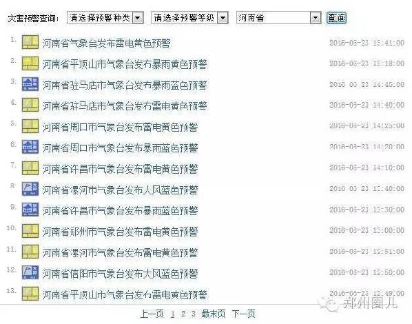 郑州气象台23日10:30发布暴雨黄色预警信号:预计未来6小时郑州市区降水量将达到50毫米以上,并伴有短时强降水局地雷暴大风等强对流天气。