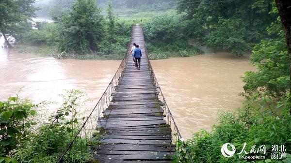 湖北咸丰:河水暴涨淹没滚水坝 村民出行全靠“甩甩桥”