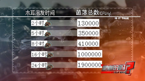 陈尔凝说:“因为木耳本身是干制的,微生物没有水的话它是没法繁殖了。但是你浸泡的这个过程中微生物有了充足的水分,木耳本身又是一种营养比较丰富的食物,易于微生物的繁殖。加上现在是夏天,温度比较高,微生物的繁殖速度比较快,这就导致了在泡木耳的过程中这个微生物的数量会爆发式增长。”